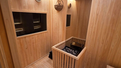 이 공간은 편백나무로 마감된 사우나 시설로 이어집니다.
