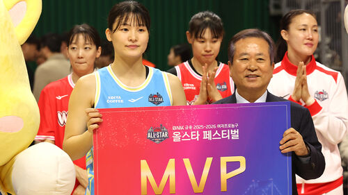 ▲ 4일 부산 사직체육관에서 열린 BNK금융 2025-2026 여자프로농구 올스타페스티벌에서 팀 포니블 변소정(BNK)이 MVP를 수상하고 있다.