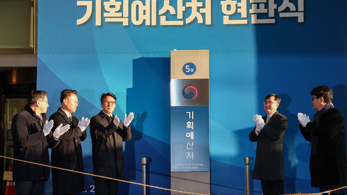 ▲ 김민석 국무총리와 임기근 차관을 비롯한 기획예산처 공무원들이 지난 2일 정부세종청사 5동에서 기획예산처 현판을 제막한 뒤 박수를 치고 있다.