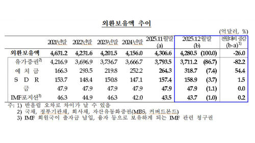 오늘(6일) 한국은행에 따르면 작년 12월 말 기준 우리나라 외환 보유액은 4천280억 5천만 달러(약 618조 원)로, 전월보다 26억 달러 감소했습니다.