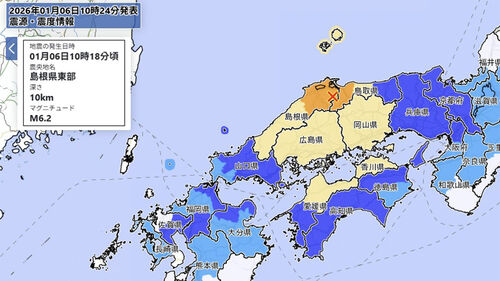 일본 혼슈 서부 시마네현에서 오늘(6일) 오전 10시 18분쯤 규모 6.2의 지진이 발생했다고 일본 기상청이 발표했습니다.