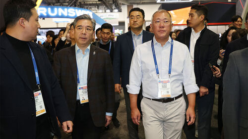 ▲ 정의선 현대차그룹 회장이 6일(현지시간) 미국 네바다주 라스베이거스 컨벤션센터(LVCC)에서 장재훈 부회장과 이동하고 있다.