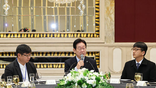 ▲ 중국을 국빈 방문 중인 이재명 대통령이 7일 상하이의 한 호텔에서 순방 기자단 오찬 간담회를 하고 있다.