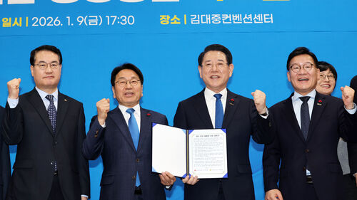 ▲ 강기정 광주시장과 김영록 전남지사와 참석자들이 9일 오후 광주 서구 김대중컨벤션센터에서 열린 광주·전남 행정통합 시도민 보고회에서 합의문을 발표한 뒤 기념사진을 찍고 있다