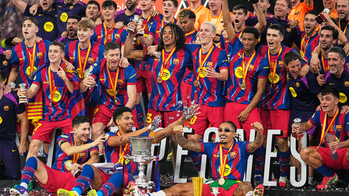 ▲ 스페인 슈퍼컵 결승전에서 바르셀로나 선수들이 승리한 후 기뻐하고 있다.