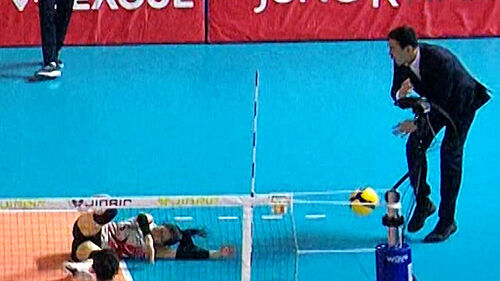 여자배구 페퍼저축은행 조이 선수의 강력한 스파이크가 정관장 고희진 감독을 맞혀버렸습니다.