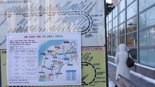 ▲ 서울 시내버스 노동조합이 첫차부터 무기한 전면 파업에 돌입한 13일 서울 강동구 명일동 한 버스정류장에 무료 셔틀버스 운행 안내문이 붙어 있다.