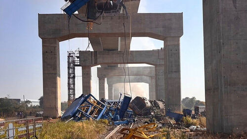 ▲ 14일(현지시간) 태국 중부 나콘랏차시마주 시키오 지역의 고속철 고가철도 공사장에서 크레인이 붕괴, 아래 철로를 지나던 열차를 덮쳐 최소 22명이 숨졌다.
