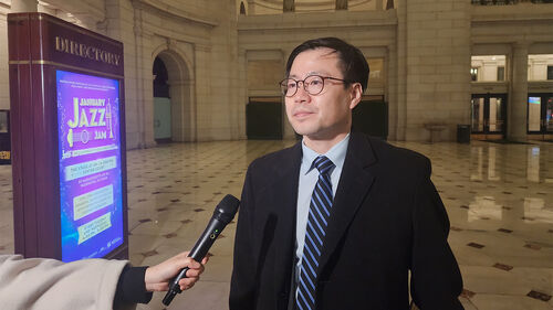 ▲ 미국을 방문 중인 여한구 산업통상부 통상교섭본부장이 현지 시간 14일 워싱턴DC의 유니온역에서 한국 특파원들과 만나 질문에 답하고 있다.