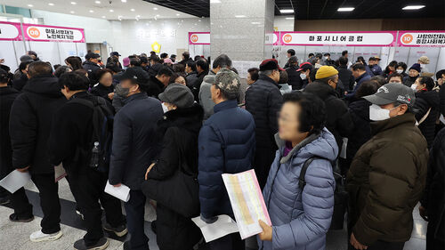 ▲ 서울 마포구청에서 열린 마포구 노인일자리 박람회를 찾은 시민들이 일자리 신청을 위해 줄을 서 있다.