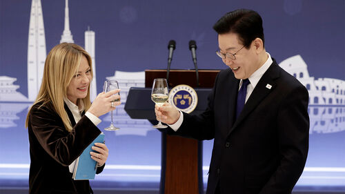 ▲ 이재명 대통령과 조르자 멜로니 이탈리아 총리가 19일 청와대에서 열린 공식 오찬에서 건배하고 있다.