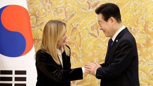 ▲ 이재명 대통령과 조르자 멜로니 이탈리아 총리가 19일 청와대에서 시민보호, 문화유산, 반도체 산업 등 한-이탈리아 협약식 후 악수하고 있다.