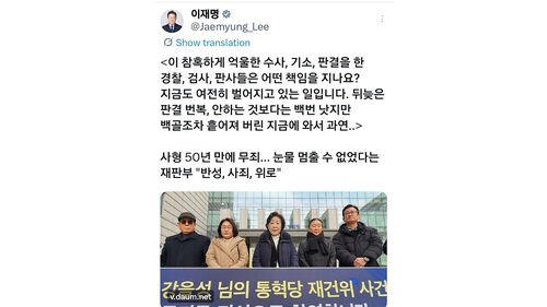 이어 "뒤늦은 판결 번복"이라며 "(번복을) 안 하는 것보다는 백번 낫지만, 백골조차 흩어져 버린 지금에 와선 과연"이라고 남겼습니다.