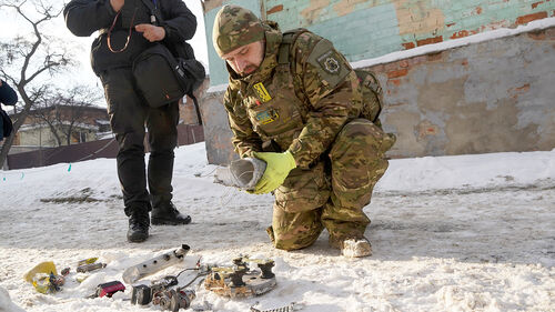 ▲ 현지시간 19일 우크라이나 시립병원 근처에 떨어진 드론 파편을 조사하고 있다.