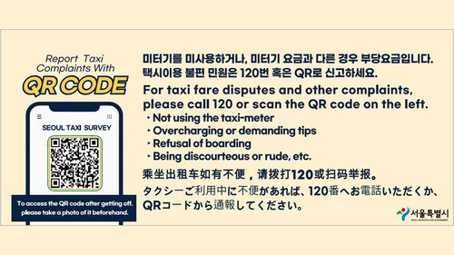 시는 외국인이 택시 이용 중 겪는 부당요금이나 불편을 바로 신고할 수 있도록 택시 내부와 관광지에 'QR 택시 불편신고 시스템' 홍보물을 부착하고 공식 사회관계망서비스(SNS)에도 홍보하고 있습니다.