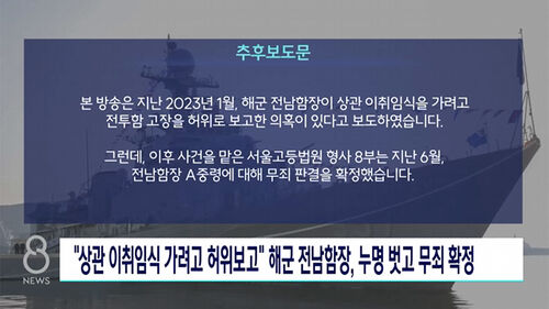 본 방송은 지난 2023년 1월, 해군 전남함장이 상관 이취임식을 가려고 전투함 고장을 허위로 보고한 의혹이 있다고 보도하였습니다. 그런데, 이후 사건을 맡은 서울고등법원 형사 8부는 지난 6월, 전남함장 A 중령에 대해 무죄 판결을 확정했습니다. 재판부는 전투함 실무자들이 자신들의 책임을 줄이고 함장 A 중령에게 책임을 전가하기 위한 방향으로 진술 내용을 사전에 조율한 정황이 확인되고, A 중령이 당시 실무자 B 씨로부터 부품 파손에 대한 보고를 받고 고장 보고가 필요하다고 판단한 것으로 보인다고 판결문에서 밝혔습니다.