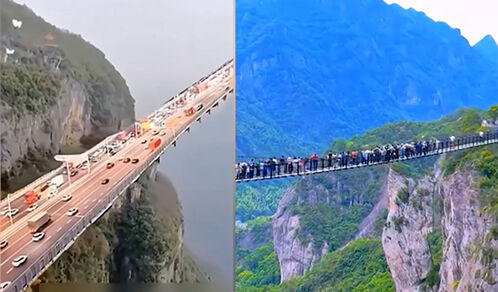 산과 산을 잇는 긴 도로와 유리 다리를 건너는 등산객의 모습이 담겼습니다.
