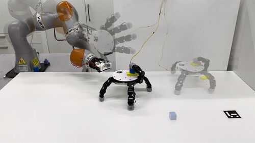 손바닥 지름 16㎝의 로봇손은 시연에서 로봇팔 손목에서 분리돼 주변을 기어 다니며 최대 3개의 물체를 차례로 회수한 다음, 회수한 물체를 손등에 올려 단단히 잡은 상태에서 로봇팔로 돌아와 재결합했습니다.