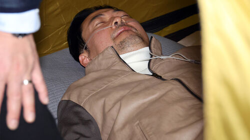 ▲ 며 단식 7일 차를 맞은 국민의힘 장동혁 대표가 21일 국회 로텐더홀 단식 농성장을 찾은 개혁신당 이준석 대표와 만나 대화를 나눈 뒤 자리에 눕고 있다.