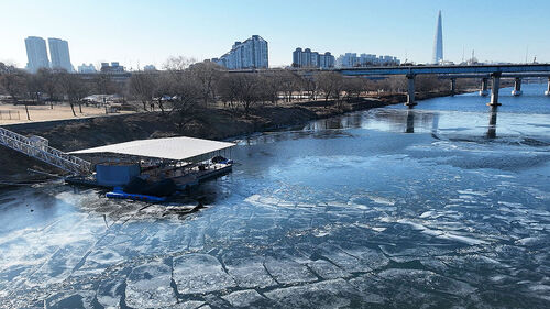 연일 강추위가 지속되면서 요트장 주변의 강물도 이렇게 꽁꽁 얼어버렸습니다.