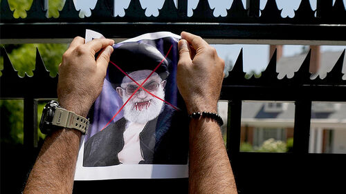 ▲ 칠레에서 열린 이란 반정부 시위 지지 집회에서 한 시위자가 이란 대사관 대문에 훼손된 이란 최고 지도자 하메네이의 포스터를 붙이고 있다.
