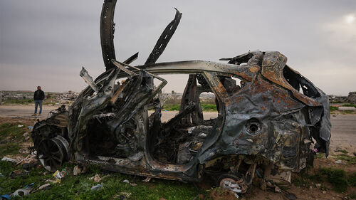 ▲ 팔레스타인인 기자 3명이 탑승했던 차량이 21일(현지시간) 이스라엘군 공격으로 불탄 모습.