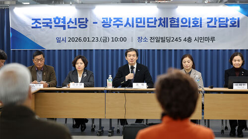 ▲ 23일 광주 동구 전일빌딩 245에서 열린 조국혁신당-광주시민단체협의회 간담회에서 조국 대표가 발언하고 있다.