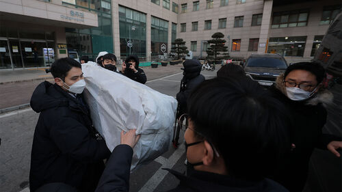 ▲ 지난 21일 군경 '북한 무인기 침투' 피의자 장 모 씨와 오 모 씨가 다니던 서울의 한 대학교 공대 건물에서 경찰 관계자들이 압수품을 옮기고 있다.