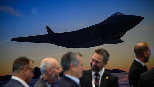 ▲ 2025년 9월 9일 영국 런던에서 열린 'DSEI UK 2025(국제 방위산업 전시회)'에 GCAP-에지윙 전투기 이미지가 전시되어 있다.
