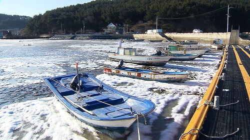 고깃배가 정박한 포구도 꽁꽁 얼어붙었습니다.