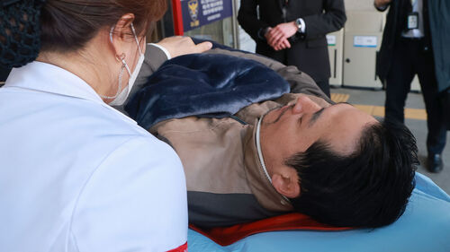 ▲ 국민의힘 장동혁 대표가 지난 22일 건강 악화로 서울 관악구의 한 병원으로 이송되어 도착하고 있다.