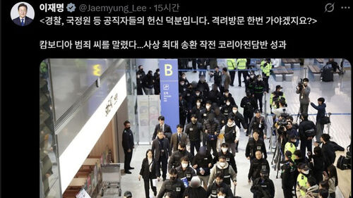 이 대통령은 오늘(25일), 자신의 SNS에 정부가 역대 최대 규모인 73명의 한국인 범죄 피의자를 캄보디아에서 국내로 송환한다는 기사를 소개하며 이같이 쓴 뒤 "격려 방문 한번 가야겠지요?"라고 적었습니다.
