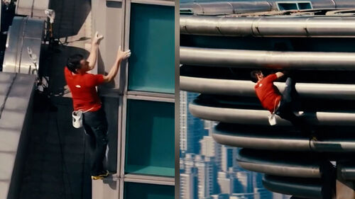 정말 안전로프나 보호 장비 하나 없이 건물 외벽을 오르고 있네요.