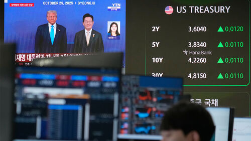 ▲ 서울 하나은행 본점 외환거래실에서 도널드 트럼프 미국 대통령(왼쪽)과 이재명 한국 대통령이 화면에 등장하고 있다.