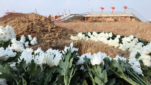▲ 12·29 제주항공 여객기 참사 1주기인 지난달 29일 무안국제공항 참사 현장에 국화가 놓여있다