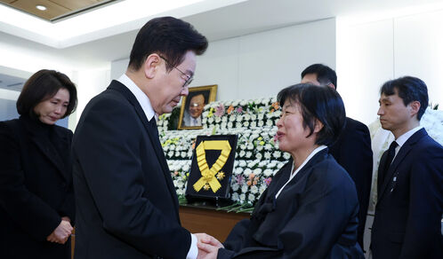 ▲ 이재명 대통령이 27일 서울 종로구 서울대병원 장례식장 고 이해찬 전 국무총리 빈소에서 유가족을 위로하고 있다.