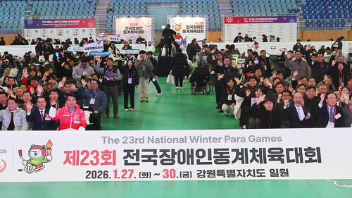 ▲ 27일 강릉 아이스 아레나에서 열린 제23회 전국장애인동계체육대회 개회식에서 참가자들이 기념촬영을 하고 있다.