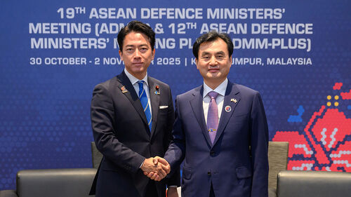 ▲ 안규백 국방부 장관이 지난해 11월 1일 말레이시아 쿠알라룸푸르에서 열린 한일 국방장관 회담에서 고이즈미 신지로 일본 방위상과 기념 촬영을 하고 있다.