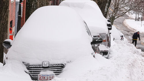 ▲ 26일(현지 시간) 미 매사추세츠주 보스턴 비컨힐에 겨울 폭풍으로 30㎝가 넘는 눈이 내린 뒤 한 주민이 눈에 파묻힌 차량을 파내고 있다.