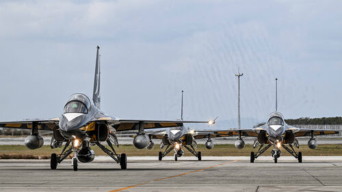 ▲ 28일 블랙이글스 T-50B 편대가 중간 기착지인 일본 오키나와 나하 기지에 착륙하고 있다.
