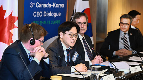 ▲ 김정관 산업통상부 장관이 26일(현지시간) 캐나다 토론토 파크 하얏트호텔에서 열린 제3차 한-캐나다 CEO 대화에서 발언하고 있다.