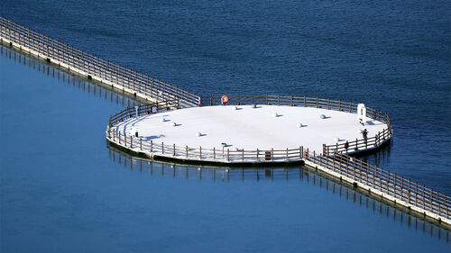 한파가 이어진 28일 속초 영랑호는 호수 중앙에 설치된 부교를 기준으로 서쪽 수역은 얼음으로 뒤덮였지만, 동쪽 수역은 물결이 치며 뚜렷한 대비를 보였습니다.