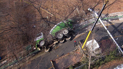 레미콘 차량이 가드레일을 넘어 인도 쪽으로 넘어져 있습니다.