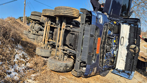 오늘(31일) 오전 10시 33분쯤 충남 당진시 송산면의 한 비탈길에서 토사를 싣고 가던 25톤 덤프트럭이 넘어졌습니다.