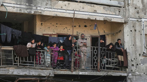 ▲ 공습당한 후 경찰서를 바라보는 팔레스타인 가족