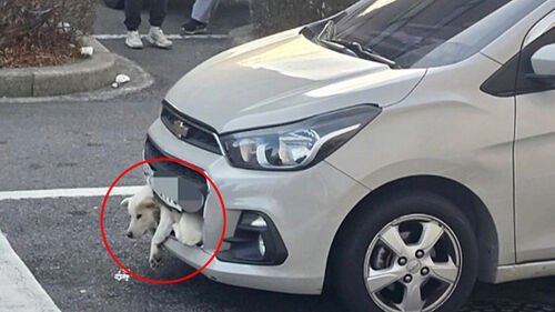 차량 앞 범퍼에 개가 낀 모습이 담긴 사진이 온라인에 확산하며 논란이 일고 있습니다.