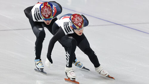 ▲ 2026 밀라노·코르티나담페초 동계올림픽 개막을 4일 앞둔 2일(현지시간) 이탈리아 밀라노 아이스스케이팅 아레나에서 쇼트트랙 임종언(앞)과 이준서가 훈련하고 있다.