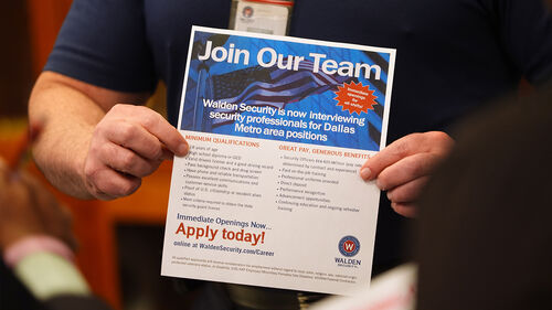 ▲ 미국 텍사스주 댈러스에서 열린 채용 박람회에서 담당자가 채용 정보를 들고 있다.