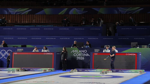 ▲ 4일(현지시간) 밀라노·코르티나 동계올림픽 컬링 믹스더블 라운드로빈 경기가 열린 이탈리아 코르티나담페초 컬링 올림픽 스타디움에서 일부 조명과 스코어보드, 전광판이 정전돼 경기가 중단되고 있다.