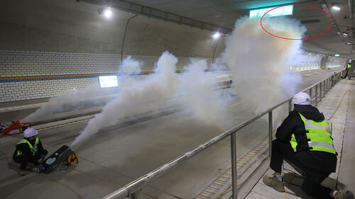 앞서 3개의 연기 발생기를 이용해 터널 내부에 40초가량 연기를 뿜어냈는데, 불과 20여 초 뒤 연기가 제연 설비 안으로 모두 빨려 들어가며 눈으로는 보이지 않았습니다.